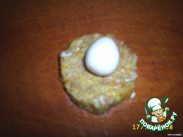У меня был фарш который остался от приготовления голубцов (с добавлением жареного лука и моркови). Из фарша формируем лепешечки и вкладываем яичко.