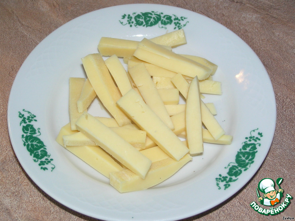 Сыр нарезать полосками. Немного сыра (для посыпки) натереть на мелкой терке.