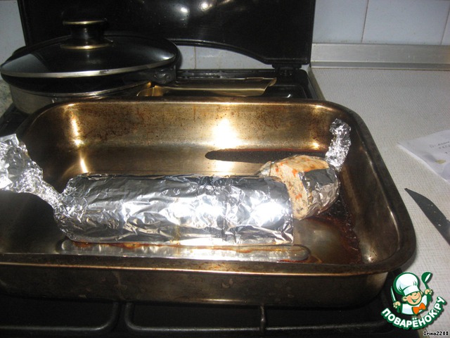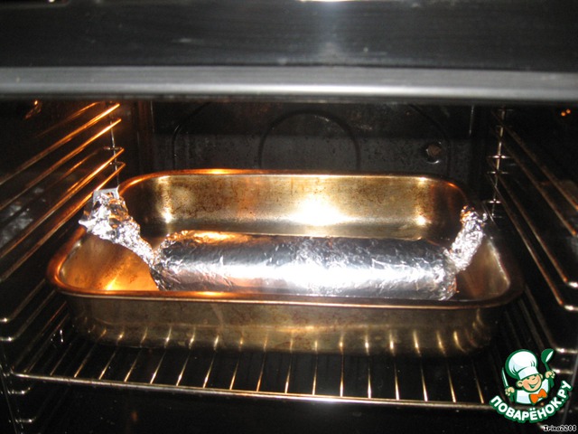 Замотать фольгу колбаской и отправить в духовку при 200-230 град на час-полтора. У меня пеклось час пятнадцать примерно, я прокалывала шпажкой,