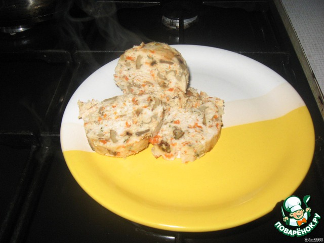 | Отличная замена магазинным колбасам из всяких отходов и красителей. Предполагается запекать ветчину в рукаве в консервной банке из-под ананасов или персиков, но у меня банки не оказалось и пришлось выходить из положения вот таким образом... |