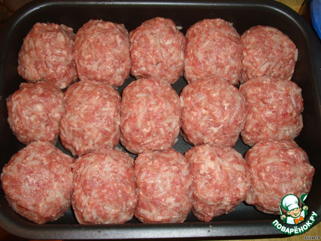 Делаем из фарша шарики и выкладываем в противень плотно.