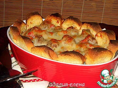 Теперь положить на хлеб фрикадельки с соусом и посыпать сверху сыром. Выпекать при 190 градусах 10-15 мин.