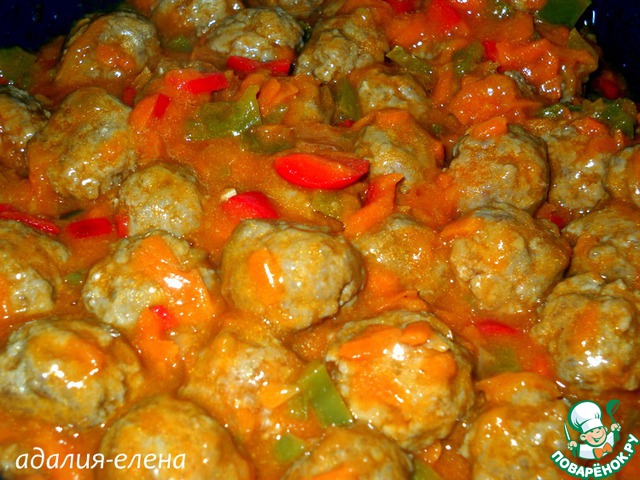 В масле, где жарились фрикадельки, пассеровать лук и морковь до золотистого цвета. Затем добавить порезанный перец и потушить почти до готовности. Если надо, долить несколько ложек воды. Вместо перца подойдет зеленый горошек.