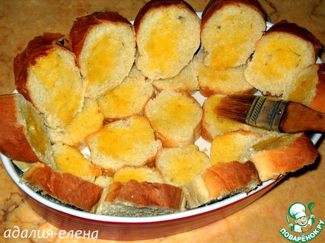 Нарезать хлеб пятачками или треугольниками и положить на дно и по кругу формы для запекания. Смазать слегка сливочным маслом и поставить в духовку (180 градусов) на 10 мин.