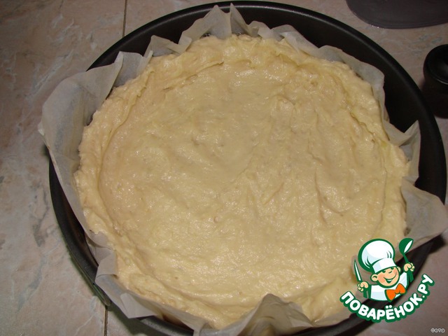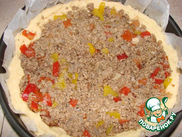 Тесто: отвариваем картофель в подсоленной воде, смешиваем с маслом сливочным, яйцами и мукой. Замешиваем и выкладываем в форму на бумагу, смазанную маслом. Делаем небольшие бортики.