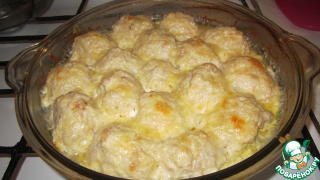 Сверху посыпаем тертым сыром и отправляем в духовку до зарумянивания сыра. За это время наши котлетки успеют хорошенько пропитаться сливками, тем самым станут еще нежнее. Я накрыла форму разрезанным пакетом для запекания.