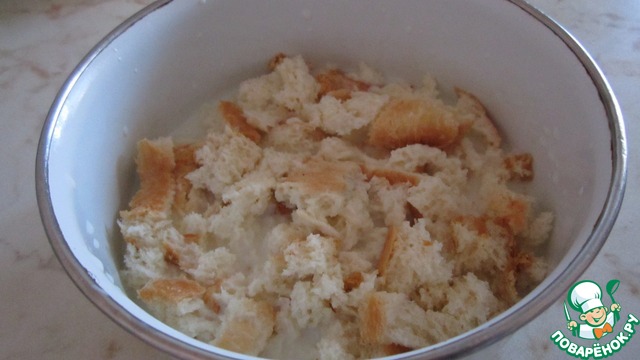 Тостовый хлеб ломаем на кусочки и заливаем молоком, даем немного времени напитаться.