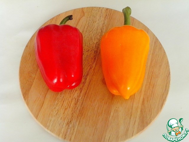 Помыть и обсушить болгарский перец. Разрезать пополам вдоль и вынуть семена. Запечь в духовке или микроволновке, остудить и снять кожу, затем мелко нарезать. Я не запекала, а просто нарезала мелким кубиком.