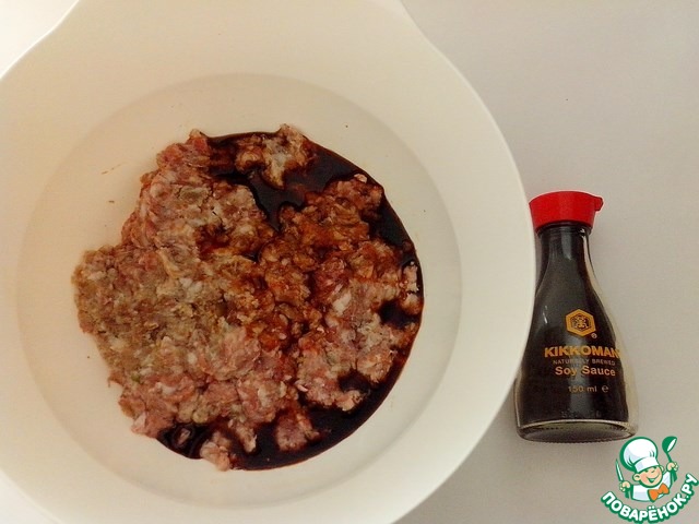 В фарш добавить соевый соус ТМ Kikkoman и по желанию соль. Перемешать.