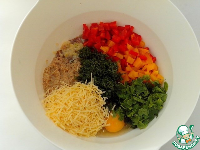К фаршу добавить болгарский перец, чеснок и лук ( пропущенные через блендер или мясорубку), петрушку и укроп (мелко порезанные), сыр (натертый на средней или мелкой терке), панировочные сухари и яйцо. Хорошо перемешать.