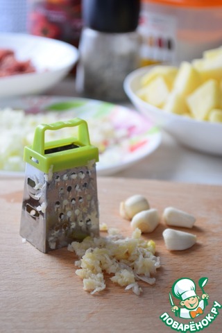 Пока обжаривается картофель, готовим соус: в теплой воде разводим томатную пасту, добавляем чеснок, перемешиваем.