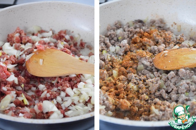 В глубокой сковороде разогреваем растительное масло и обжариваем фарш вместе с луком. Солим, добавляем специи, перемешиваем.