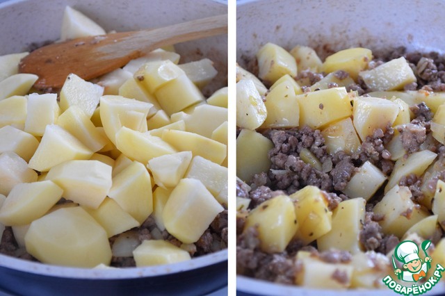 Добавляем картофель, перемешиваем и жарим на среднем огне 5-7 мин.