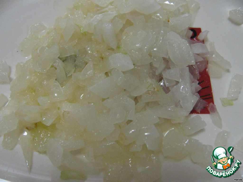 2. Для начинки: Лук и сыр мелко нарезать. Лук потушить в разогретом растительном масле на слабом огне до прозрачности и снять с огня.
