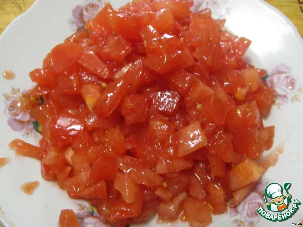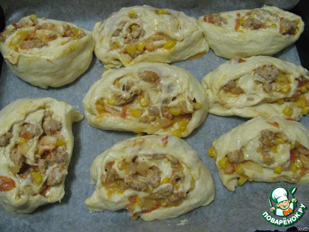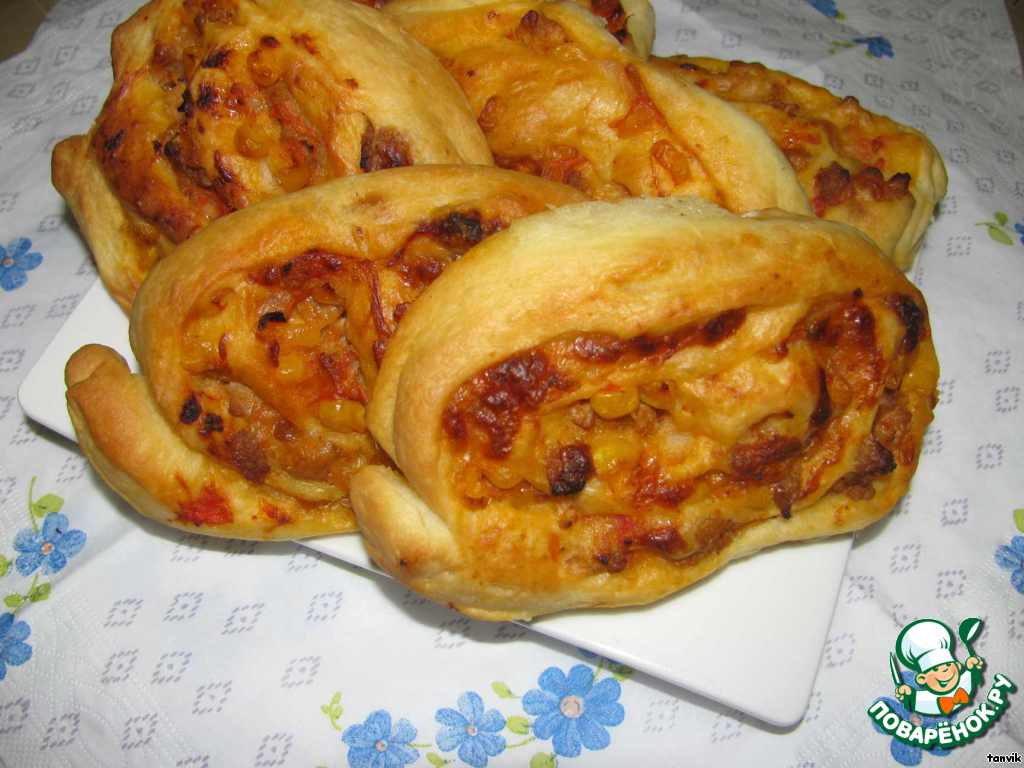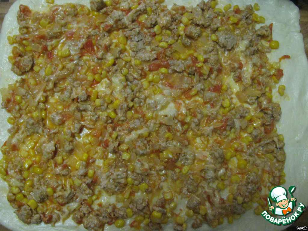 4. После лука в сковороду положить фарш и обжарить. К фаршу добавить лук, помидоры, кукурузу. Посолить и поперчить, приправить паприкой и кетчупом. Добавить сыр и перемешать. Тесто раскатать в пласт толщиной 0,5 см и выложить на него начинку, оставляя свободным край шириной 2 см.