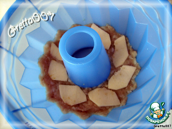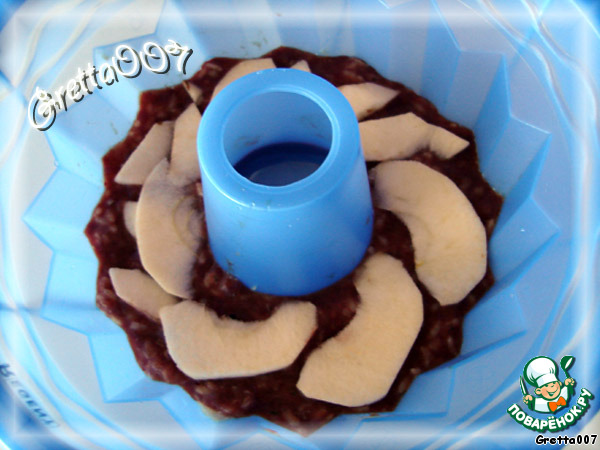 Выложить всё в силиконовую форму слоями, чередуя фарш из филе грудки и фарш из печени, на каждый слой положить тонкие ломтики очищенного яблока.