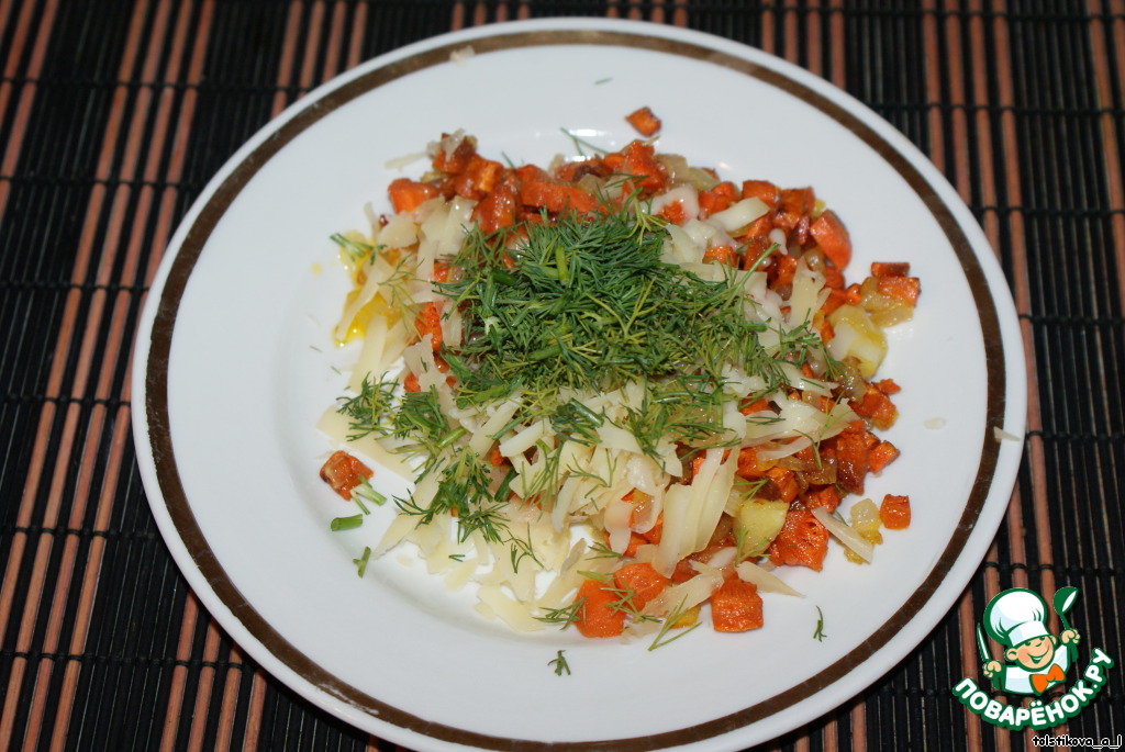 Для морковной начинки: мелко порежем и обжарим морковь и лук, посолим, добавим 1 ст. л. сыра, зелень.