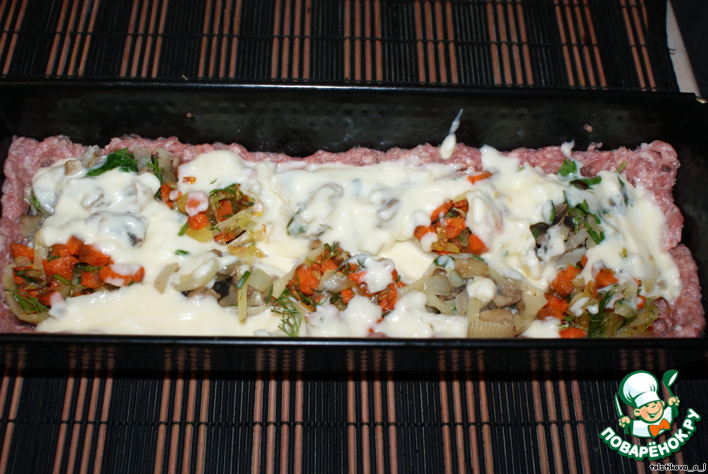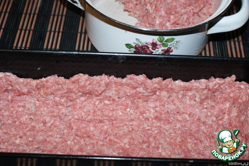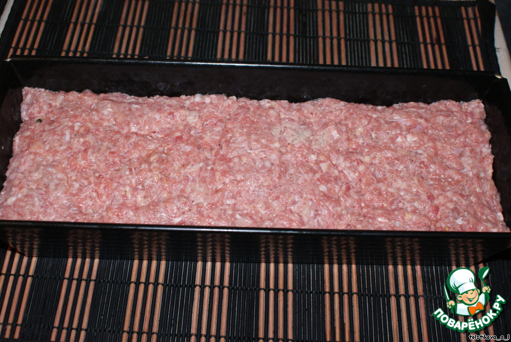 Сверху уложить оставшийся фарш, разровнять.