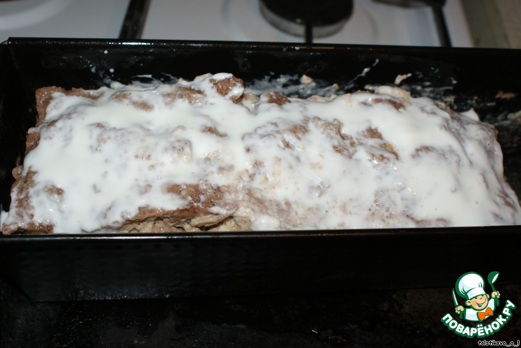 По истечении времени достать форму, снять фольгу. Запеканка уменьшилась в размерах и образовалось много мясного сока. Я его слила, обмазала сметаной запеканку и поставила форму в духовку до подрумянивания, минут на 5-7.