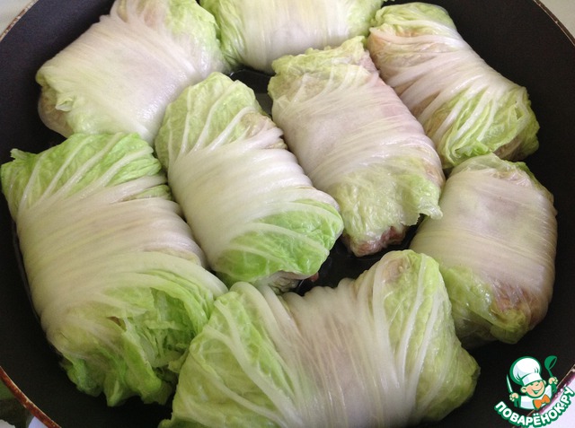 Аккуратно с листьев капусты срезаем подложку. В центр листа выкладываем фарш и заворачиваем конвертиком
