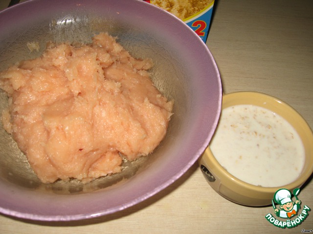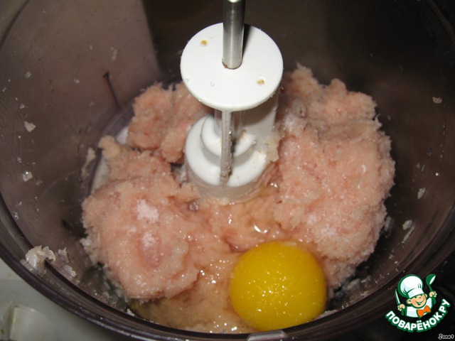 Мякоть курицы, очищенное от плёнок и шкурки, перемолоть в блендере или мясорубке. Добавить 1 яйцо и морскую соль.