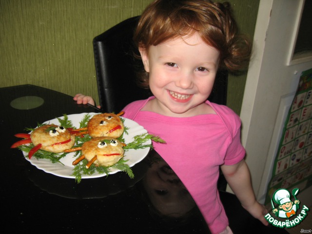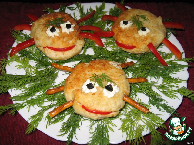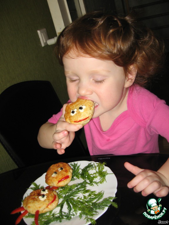 | Рецепт нашла в своих старых записях, увидела его когда-то в журнале для молодых мамочек, в каком уже и не помню. Я тогда была ещe беременна и собирала все интересненькое для будущего малыша! Доченьке очень понравились Паучки, да и мы с папой не отказались от них! Взрослым захотелось съесть сразу всe!!!! |
