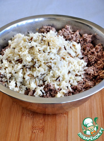 Так же пропустить через мясорубку лук, бекон (в оригинале шкварки) и рис.