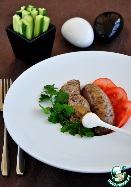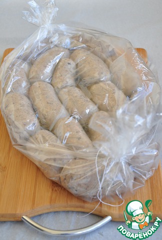 Череву промыть под проточной водой, начинить с помощью насадки. (Если оставите рис целым, ни в коем случае не начиняйте череву плотно, она может лопнуть во время приготовления.) Сформировать и перевязать колбаски. Я уложила их в рукав для запекания и погрузила в воду, нагретую до 85*, на 15 минут.