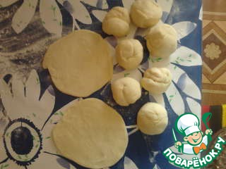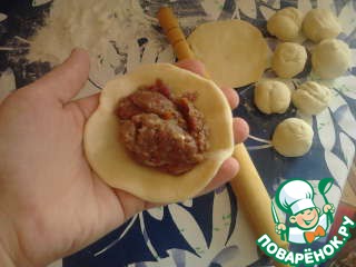 Данное количество теста делим примерно на 22-23 кусочка, скатываем в шарики и раскатываем лепешки, немного толще, чем на пельмени, стараясь сделать края потоньше, а серединку потолще.