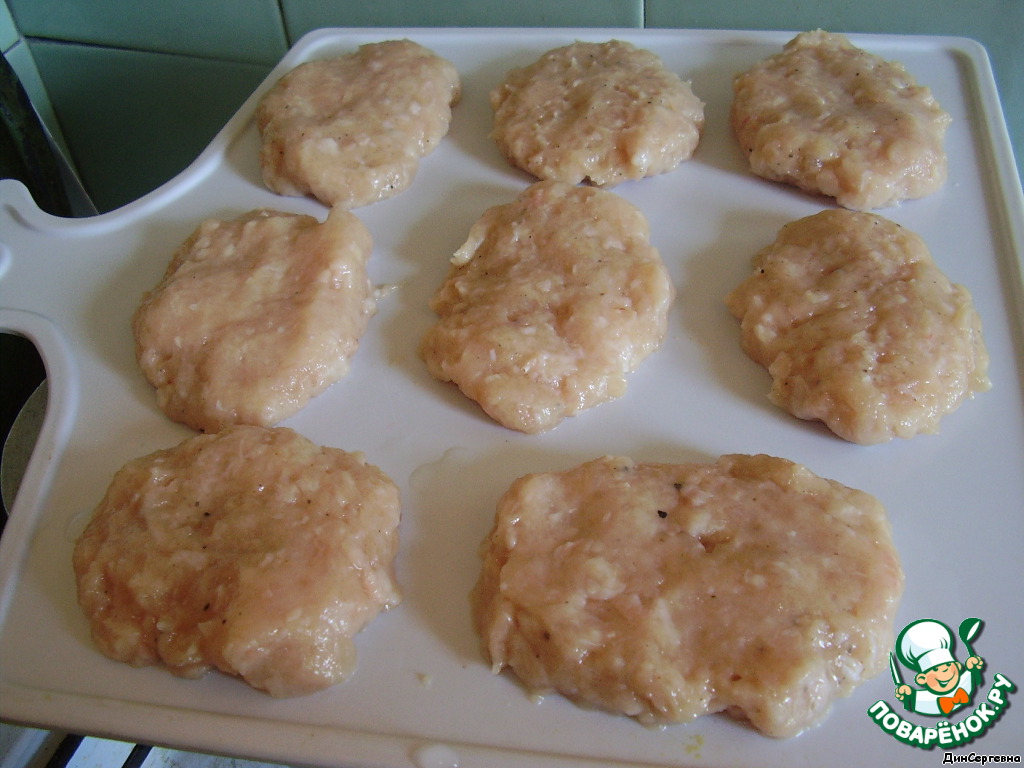 Куриный фарш солим, перчим, добавляем яйцо и хорошо вымешиваем. Делаем небольшие лепешки.