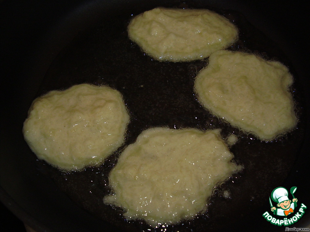 На сковороду с раскаленным маслом ложкой выкладываем кабачковое тесто, стараясь сделать оладьи по размеру примерно одинаковыми с лепешками.