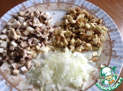 Нарезаем маленькими кубиками: один небольшой баклажан, 2 небольших шампиньона, половину небольшой луковицы.