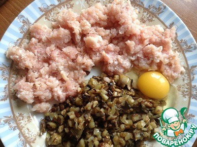 Смешиваем фарш, небольшое яйцо и поджаренные овощи.