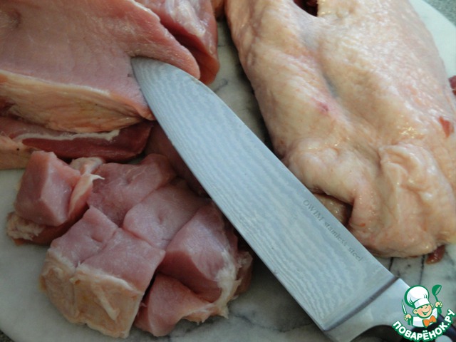 Тем временем мясо крупно порезать. Петрушку обобрать и оставить только листики.