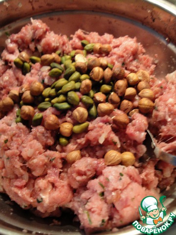 Теперь добавить орехи и специи по вкусу. Раньше у меня былa небольшая проблема с этим. Я знаю, что многие могут пробовать мясо на соль сырым. Но не я. Поэтому я вывела для себя такую формулу. На килограмм мяса - 18 г соли, 3-4 г перца и 1 г специй по вкусу. Может, кому-то тоже пригодится.