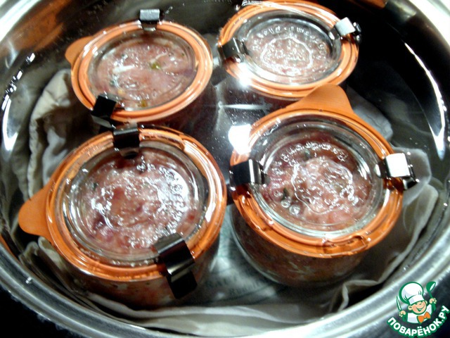 А для баночек нужно в кастрюлю положить полотенчик, поставить баночки и залить холодной водой. Поставить на огонь. Довести до кипения, убавив огонь, варить (стерилизовать) 40 мин.
