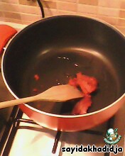 в глубокой и широкой кастрюле обжарить в растительном масле томатную пасту, добавить воды и хорошо размешать.