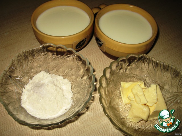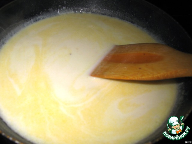 Растопить сливочное масло в сковородке (с толстым дном), ни в коем случае не жарить. Всыпать муку и, постоянно помешивая, поджарить пару секунд.