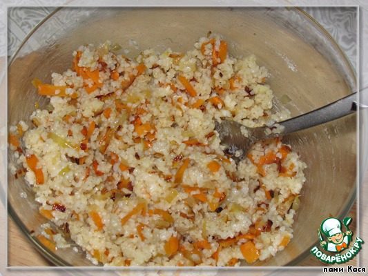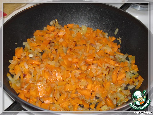 Каша наша сварилась. Берем половинку пакетика, добавляем лук и морковку, перемешиваем. Добавляем пару ложек бульона.