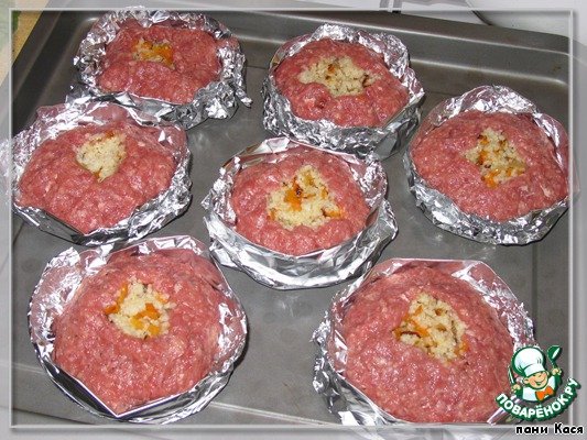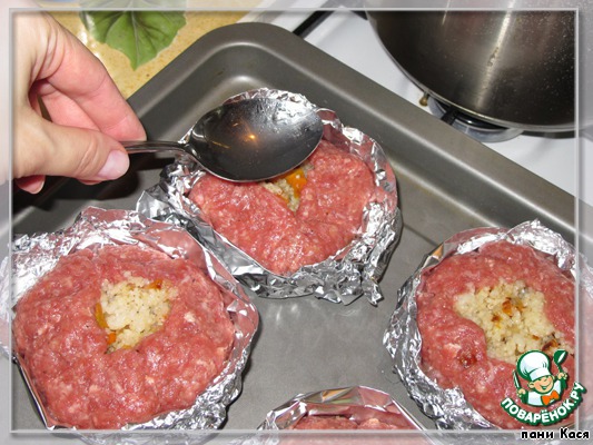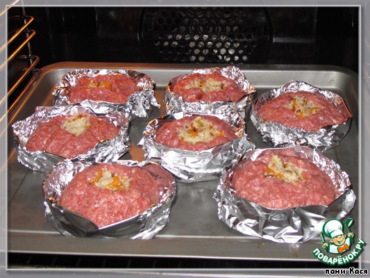Минут через 30 от начала запекания я их вытащила, примяла серединку (каша стала вылезать из-за того, что сжимается фарш), долила еще больончика в каждую.