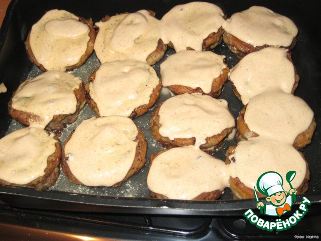 Обжаренные котлетки складываем в форму для запекания бубликами вверх, обмазываем соусом сверху, добавляем в форму немного водички и запекаем в духовке минут 15.