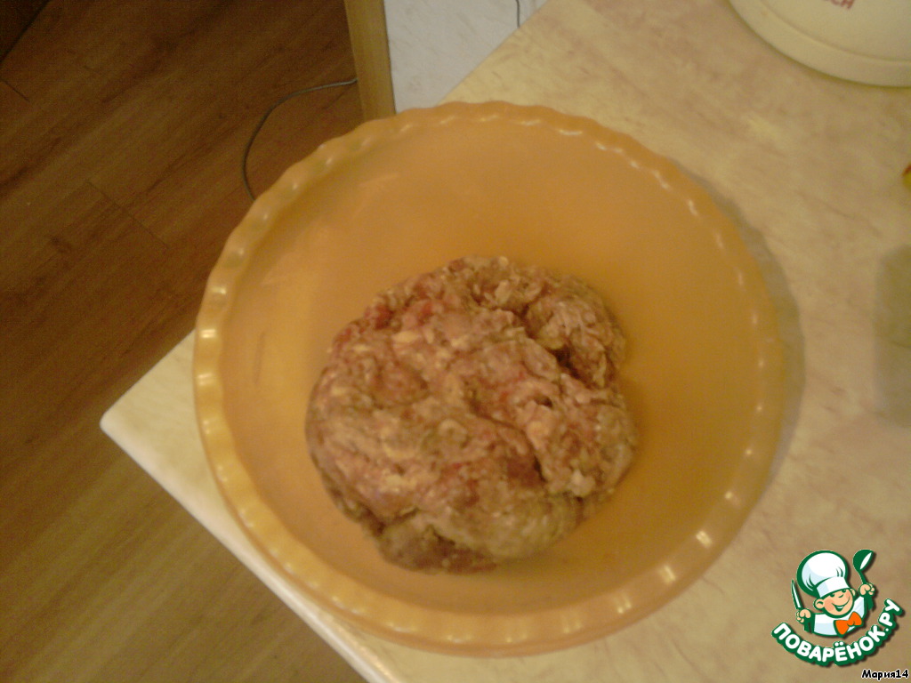Я взяла уже готовый фарш (свинина пополам с говядиной, 1 луковица - пропускаем через мясорубку, добавляем 1 яйцо, соль, перемешиваем).