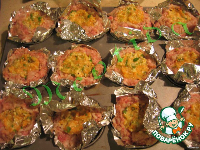 Выкладываем фарш в виде корзиночек.