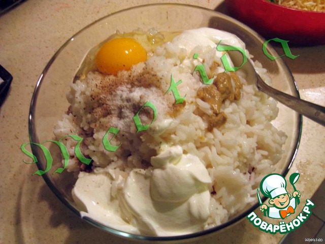 смешиваем фарш, рис, яйцо, сметанку, горчицу, приправляем солью и молотым перчиком по вкусу.