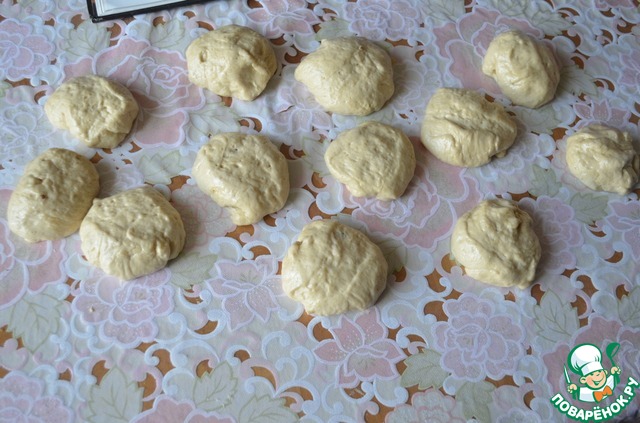 Положите тесто на расстойку в тепло еще на 1,5-2часа до увеличения вдвое. С обминкой через полчаса начала брожения. Выброженное тесто выложите на смазанный растительным маслом стол и разделите на 12 кусочков. Подкатайте слегка каждый кусочек и дайте полежать минут 8-10 под полотенцем.