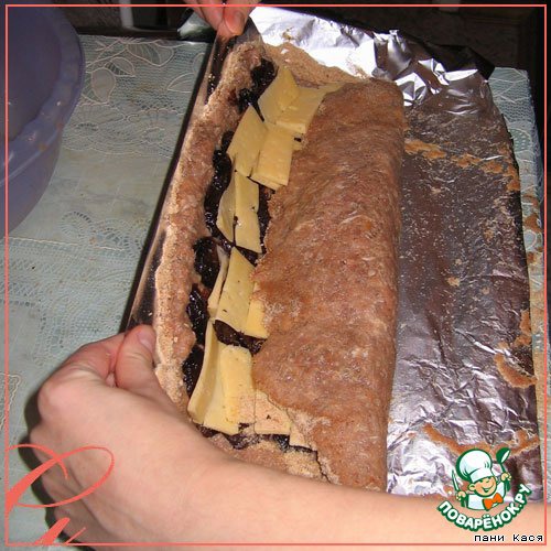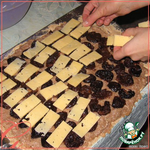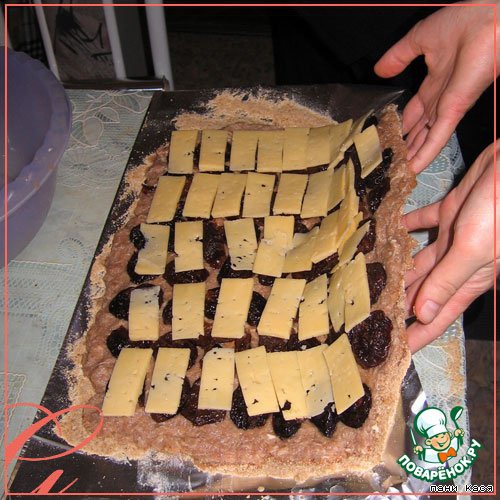 Фарш распределить в виде пласта на фольге, смазанной маслом и присыпанной панировкой (это удобно делать мокрыми руками). Уложить слоями чернослив и сыр.