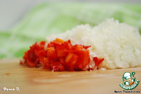 Перец чили разрезать пополам, очистить от семян, мелко нарезать.