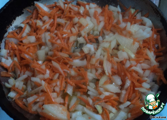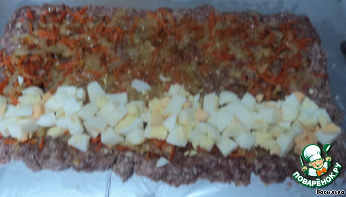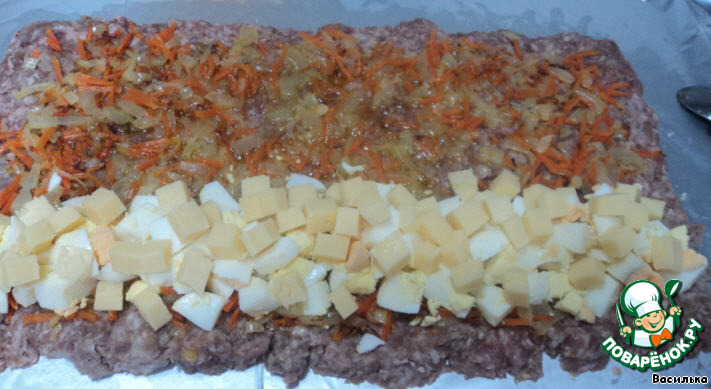 Сверху выкладываем ровным слоем морковь, обжаренную с луком.