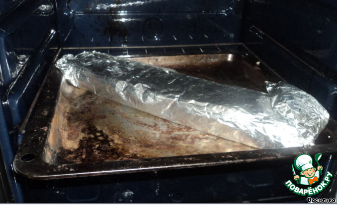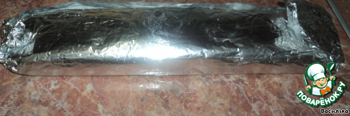 Тонким слоем раскладываем фарш на смазанную маслом фольгу.