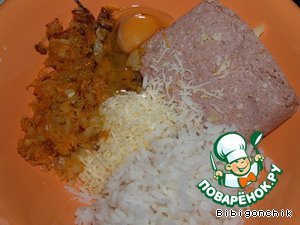 Лук обжарить на растительном масле, добавить тертую на терке морковку. Все остудить и смешать с фаршем, тертым сыром, добавить соль и перец.